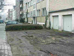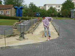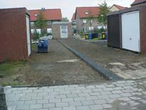 vorbereitende Arbeiten für Pflasterung mittels Wasserrinne und Schottereinbringung; Objekt Wohngebiet Krefeld-Schicksbaum